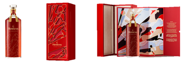 瓶頸處配有兩個紅金色象徵中華文化成功意象的馬鞍結,以及歐洲文化代表好運的馬蹄結,並收納於漆面紅木打造的限量禮盒中。優雅的深紅色漆木外盒以鏤空技法精心製作,金色駿馬圖案延續於盒身設計,喚起財富與繁榮的意象。
