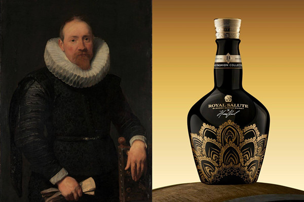 白色領子的蕾絲褶皺轉化為瓶身上的金色訂製圖紋,幾何線條俐落收邊,讓一個四百年前關於「不惜工本」的信念,在當代威士忌瓶身上重生。
