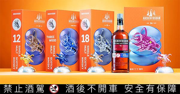 歐肯(Auchentoshan)威士忌再度攜手獲得國際紅點大獎及入選 2023 AGI 國際平面設計聯盟成員的葉忠宜設計師,以「好運龍總來」的理念,推出四款:12 年、14 年、18 年、三桶「歐肯招財龍威士忌禮盒」,為 2024 年獻上最有氣勢的新春禮盒!禮盒設計以錢進龍頭與招財龍破蛋意涵好運出龍,延伸酒標色系打造四款別具心裁的招財龍,分別包含:「萬金龍」、「藍朕龍」、「兆紫龍」、「白龍王」,待威士忌愛好者們收藏四款招財龍頭,「四龍聚寶」讓財富龍喜利耶!